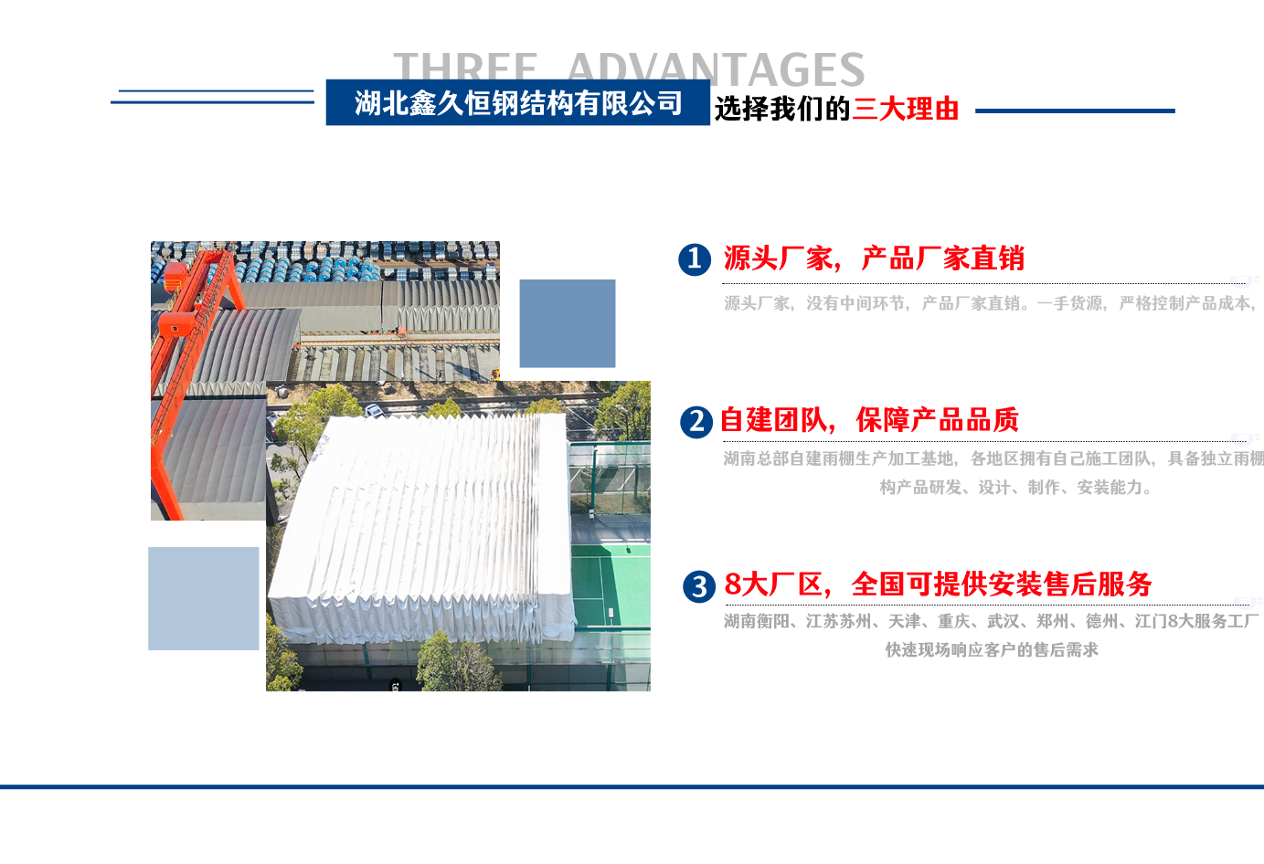 湖北鑫久恒鋼結(jié)構(gòu)有限公司是一家電動(dòng)雨棚、膜結(jié)構(gòu)車(chē)棚研發(fā),生產(chǎn)銷(xiāo)售,施工安裝于一體的專(zhuān)業(yè)鋼結(jié)構(gòu)科技公司,主要產(chǎn)品有伸縮雨棚,電動(dòng)雨棚,膜結(jié)構(gòu)車(chē)棚等。 湖南地區(qū)職員目前有80多人,占地面積20000平方米,廠房面積15600平方米,配備先進(jìn)的生產(chǎn)流水線(xiàn),使每件品質(zhì)產(chǎn)品的堅(jiān)實(shí)基礎(chǔ)。 公司在蘇州、天津、重慶、武漢、德州、烏魯木齊、江門(mén)均設(shè)有服務(wù)工廠,總?cè)藛T共300多人,擁有專(zhuān)業(yè)的技術(shù)團(tuán)隊(duì),配備先進(jìn)的設(shè)備和流水線(xiàn)生產(chǎn),產(chǎn)能高,貨源充足,發(fā)貨速度快,服務(wù)區(qū)域廣。 移動(dòng)伸縮棚適用于通道臨時(shí)倉(cāng)儲(chǔ)、戶(hù)外運(yùn)動(dòng)遮陽(yáng)、污水池遮蓋、能源交通、熱力化工、礦山、船舶制造及市政建設(shè)、物流、碼頭等領(lǐng)域的構(gòu)件制作加工,成品半成品存放、倉(cāng)庫(kù)、野外儀器設(shè)備操作用房等。尤其是對(duì)工廠發(fā)貨、倉(cāng)儲(chǔ)臨時(shí)遮雨防嗮,梅雨期較長(zhǎng)、建設(shè)周期較短的工程施工等特別適用。還可根據(jù)用戶(hù)需求量身定制、適合企業(yè)所需不同款式的產(chǎn)品。 我公司堅(jiān)持“誠(chéng)信社會(huì)為本,客戶(hù)滿(mǎn)意為榮”的經(jīng)營(yíng)理念,做到質(zhì)量把控,嚴(yán)格管理,精益求精,恪守承諾。使鑫久恒逐步走向成熟,其系統(tǒng)化、專(zhuān)業(yè)化日趨完善。以專(zhuān)業(yè)的技術(shù)、科學(xué)的管理,更高的產(chǎn)品質(zhì)量,優(yōu)良的企業(yè)信譽(yù),真誠(chéng)的客戶(hù)服務(wù),靈活多樣的經(jīng)營(yíng)方式和務(wù)實(shí)創(chuàng)新的企業(yè)精神愿與社會(huì)各界攜手合作,為推動(dòng)智能鋼結(jié)構(gòu)建筑事業(yè)的發(fā)展而不斷努力。...